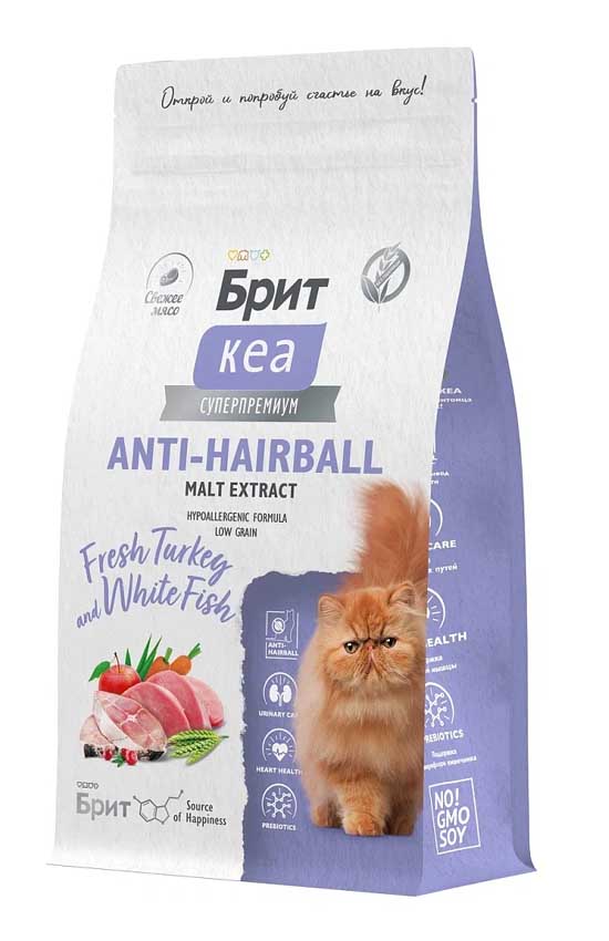 Brit Care Cat Anti-Hairball (белая рыба и индейка) - полнорационный сухой корм суперпремиум класса для взрослых кошек всех пород для выведения шерсти из организма.