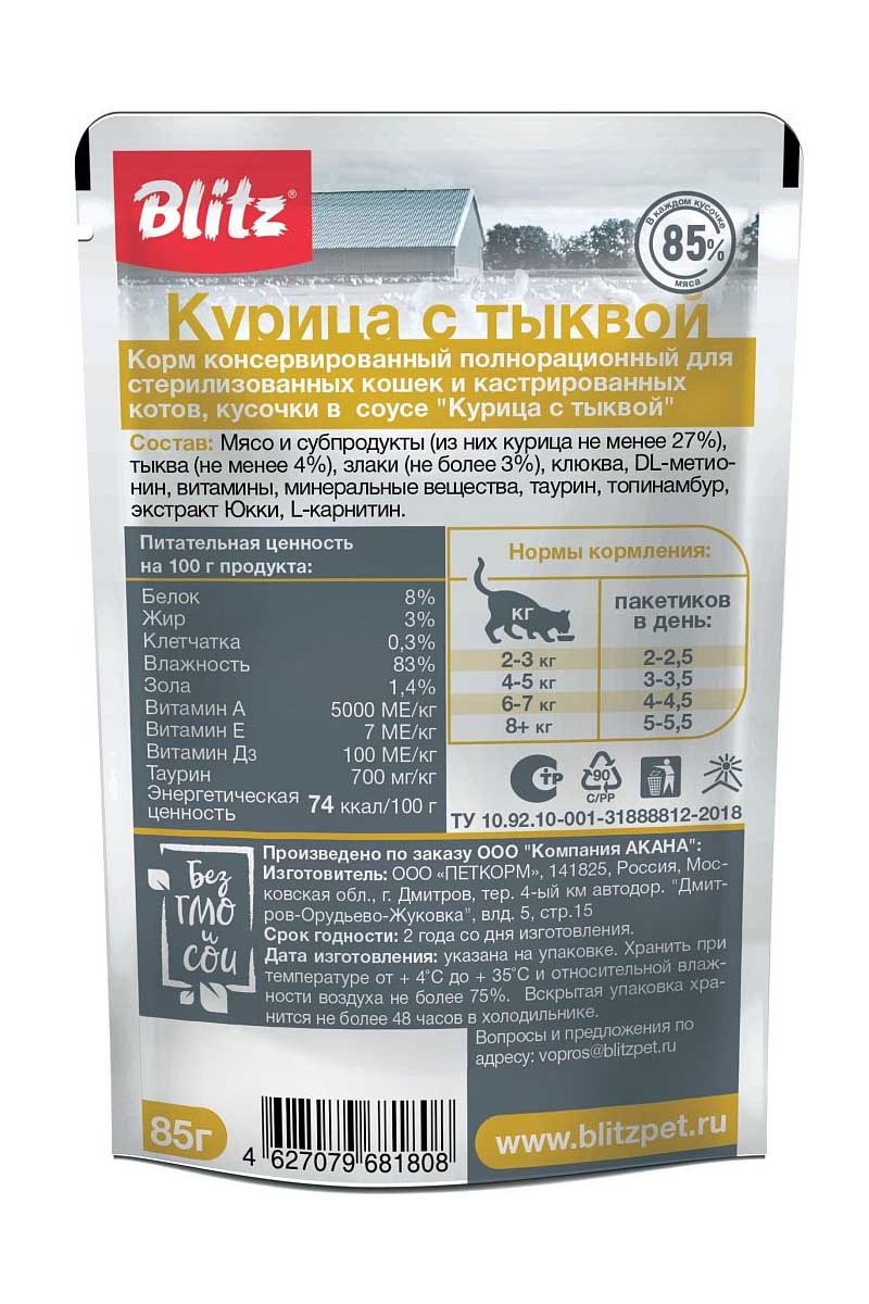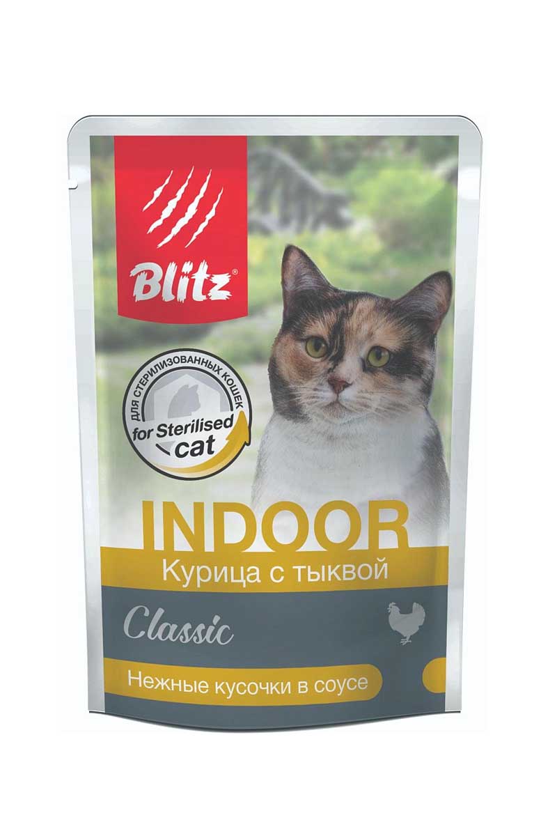BLITZ Classic Indoor Adult Cat Курица с тыквой - полнорационный влажный корм для стерилизованных кошек «Курица с тыквой» разработан с учётом всех потребностей вашего питомца. Благодаря нежному сочетанию курицы и тыквы, корм благотворно влияет на работу желудочно-кишечного тракта питомца, добавки для стерилизованных кошек способствуют профилактики МКБ, а пониженная жирность корма поможет сохранить идеальную форму при низкой физической активности.