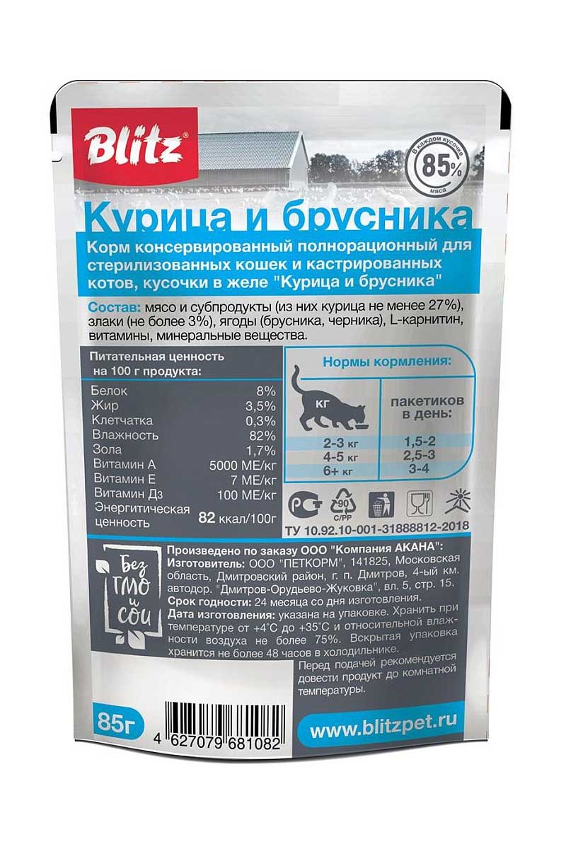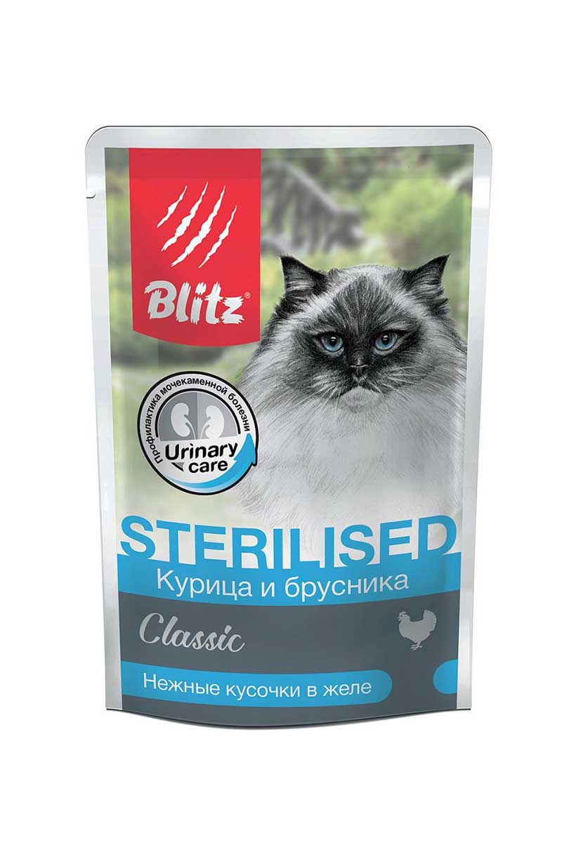BLITZ Classic Sterilised Adult Cat Курица и брусника - формула полнорационного влажного корма для кастрированных или стерилизованных кошек и котов направлена на профилактику мочекаменной болезни, а также на поддержание оптимального веса вашего питомца.