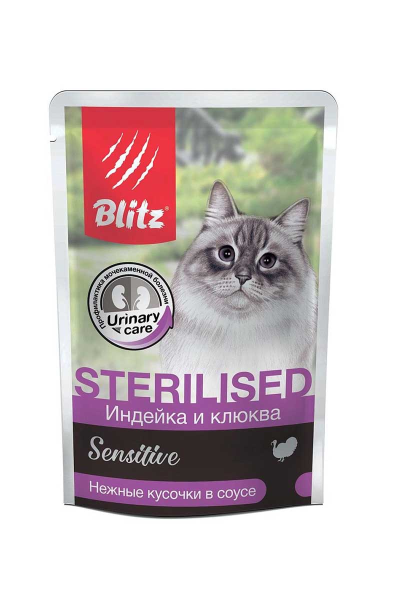 Нежные мясные кусочки Blitz Sensitive Sterilised в ароматном соусе для взрослых кошек (Индейка и клюква), 85 г.