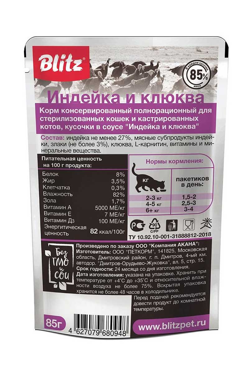 Blitz Sensitive Sterilised (Индейка и клюква), 85 г.
