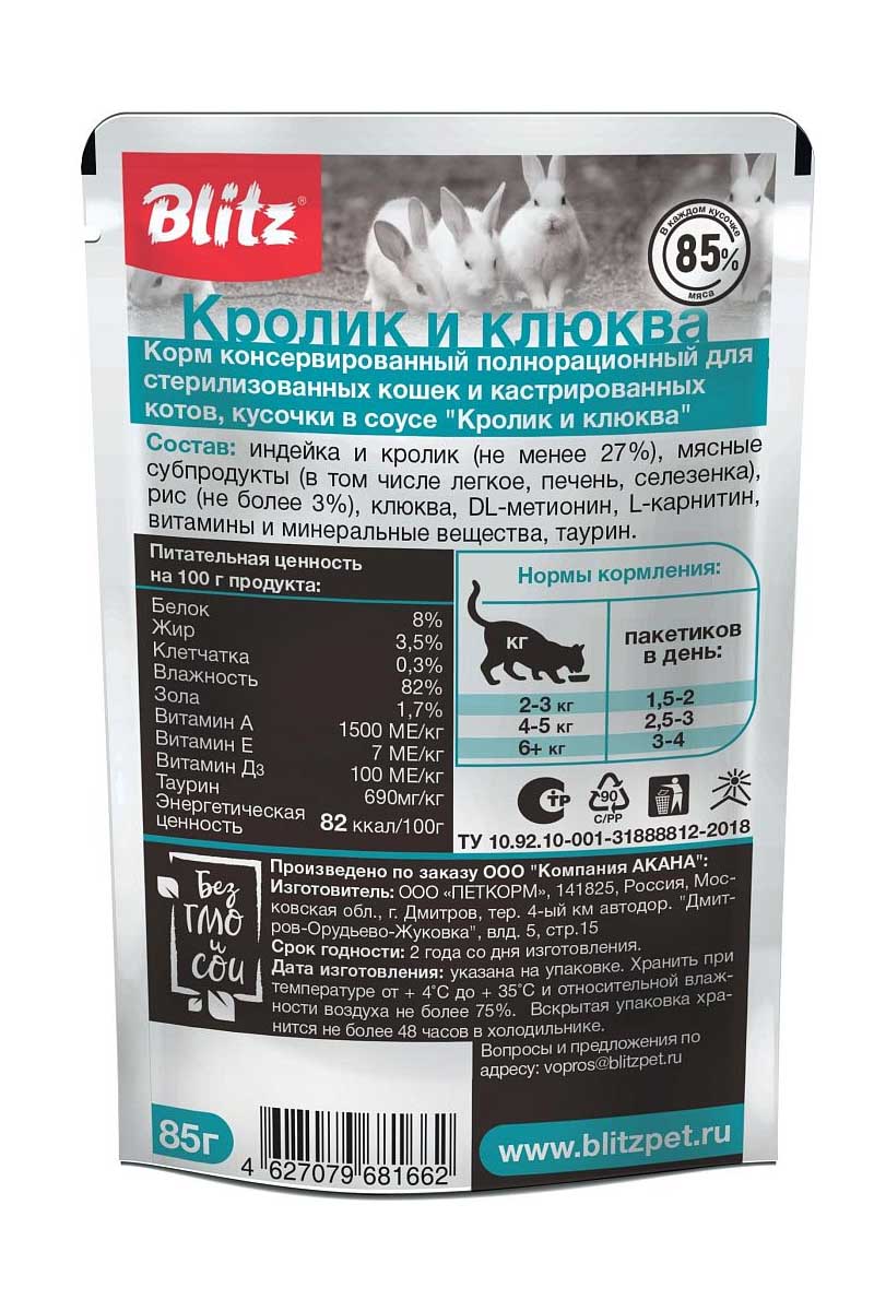 Blitz Sensitive Sterilised (Кролик и клюква), 85 г.