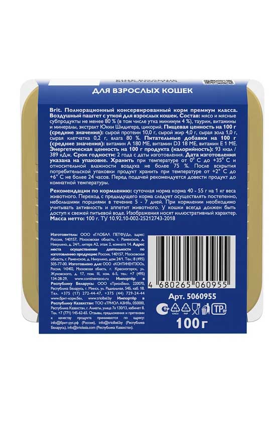 Brit Premium Воздушный паштет для взрослых кошек (Утка), 100 г