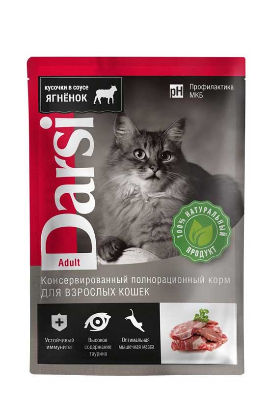 Darsi Adult Пауч для кошек (Ягненок) - консервированный полнорационный корм для взрослых кошек. Обеспечит вашего питомца всеми необходимыми питательными веществами, витаминами и элементами.