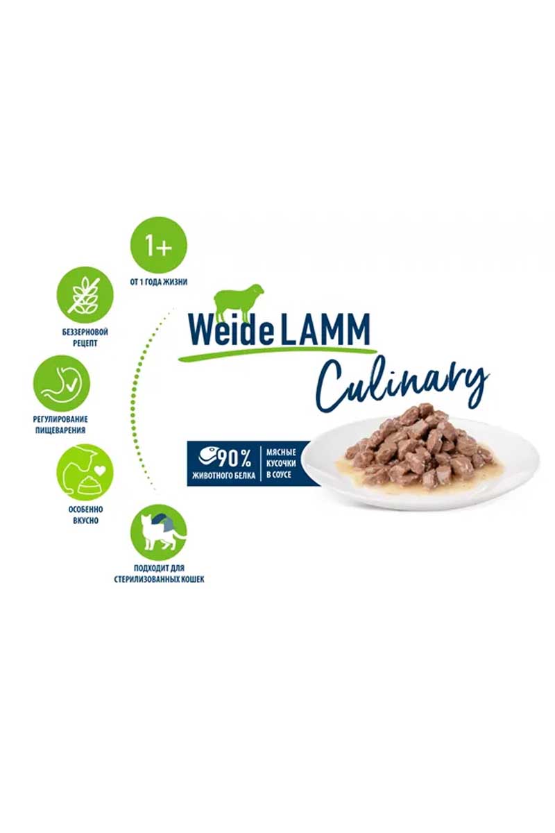 Culinary Meat in Sauce WeideLamm — влажный корм для кошек с ягненком, более 90 процентов животного белка в общем количестве белка, легко усваивается, подходит для питомцев с чувствительным ЖКТ – и при этом очень вкусный. Беззерновой влажный корм для кошек с высоким содержанием мяса особенно подходит для кастрированных и стерилизованных котов и кошек.