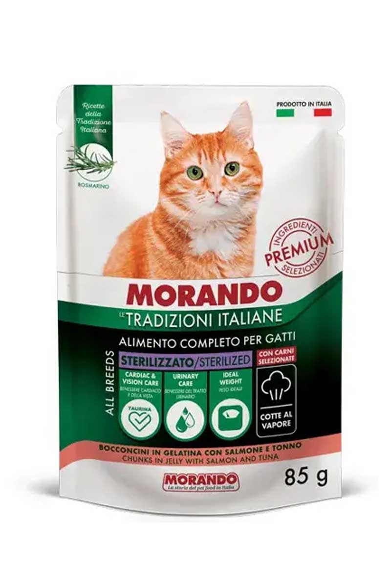 Morando Tradizioni It Sterilized Кусочки в желе (Лосось и тунец) — изысканное питание в виде кусочков в желе, приготовленных на пару с добавлением аппетитных овощей. Разработан специально для взрослых стерилизованных кошек, чтобы обеспечить идеальный баланс вкуса и здоровья.