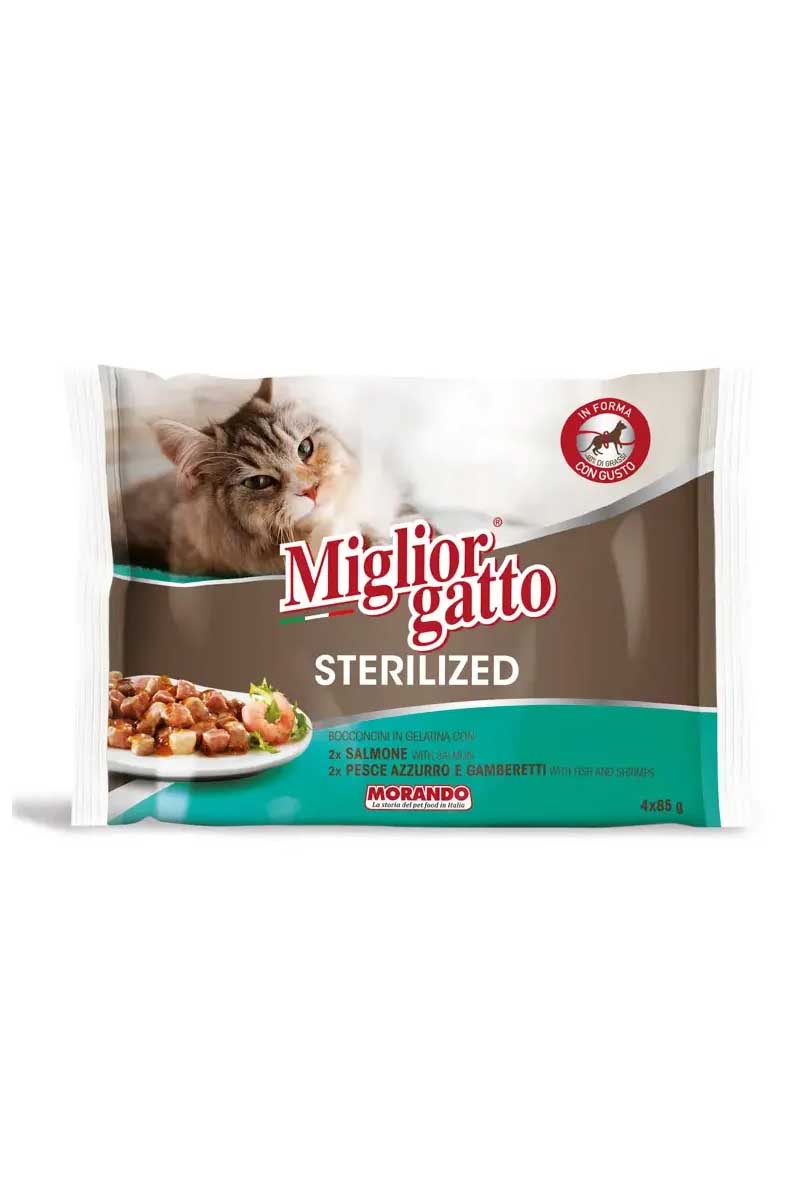 Miglior Gatto Sterilized Multi Pack Кусочки в желе — это набор беззернового влажного корма, специально разработанный для стерилизованных кошек, склонных к набору лишнего веса и имеющих риск заболеваний мочевыводящей системы.