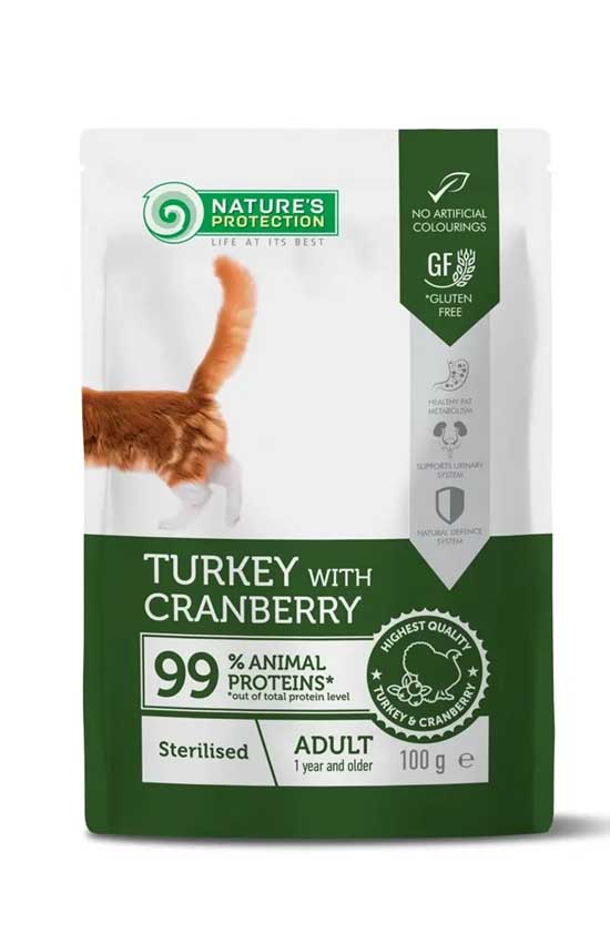 Nature's Protection Консервы Adult Sterilised (Индейка и клюква) — это супер-премиум полнорационный влажный корм для взрослых стерилизованных кошек с индейкой и клюквой во вкусном соусе.