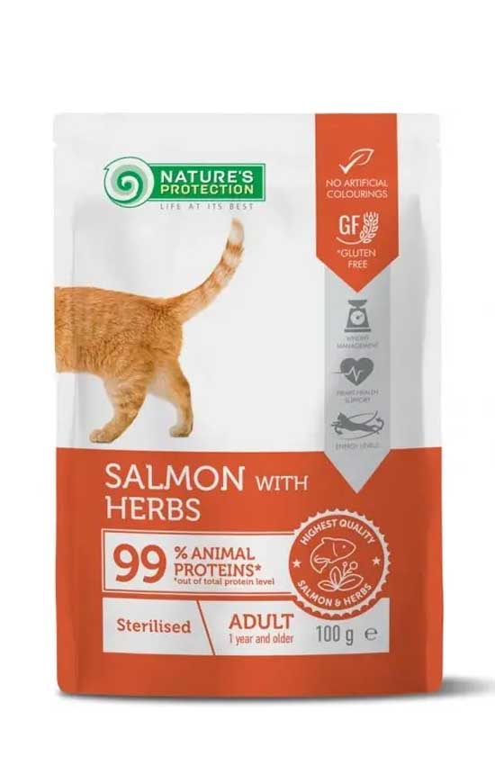 Nature's Protection Консервы Adult Sterilised (Лосось и травы) — это супер-премиум полнорационный влажный корм для взрослых стерилизованных кошек с лососем и травами во вкусном соусе, дополненный минералами.