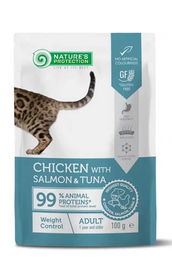 Nature's Protection Консервы Adult Weight Control (Курица, лосось и тунец) — влажный корм для поддержание нормального веса кошек с курицей, лососем и тунцом