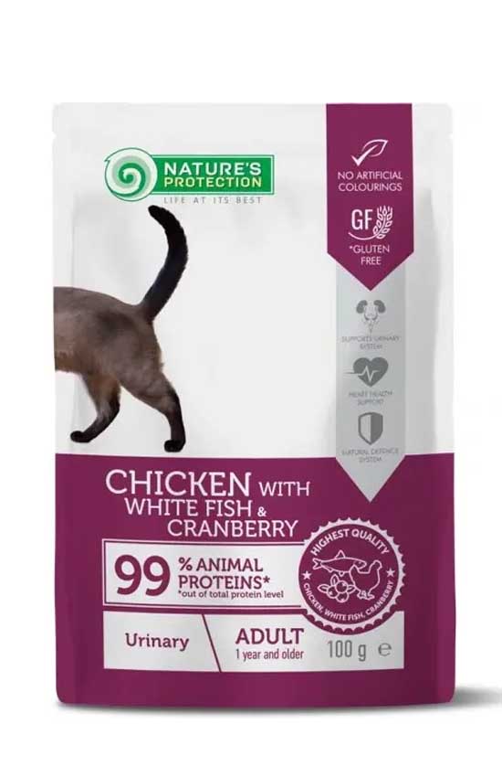 Nature's Protection Консервы Urinary Health (Курица и белая рыба) — влажный корм для взрослых кошек с чувствительной мочеполовой системой с курицей, белой рыбой и клюквой.