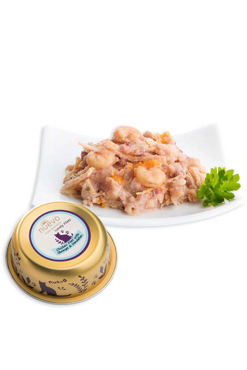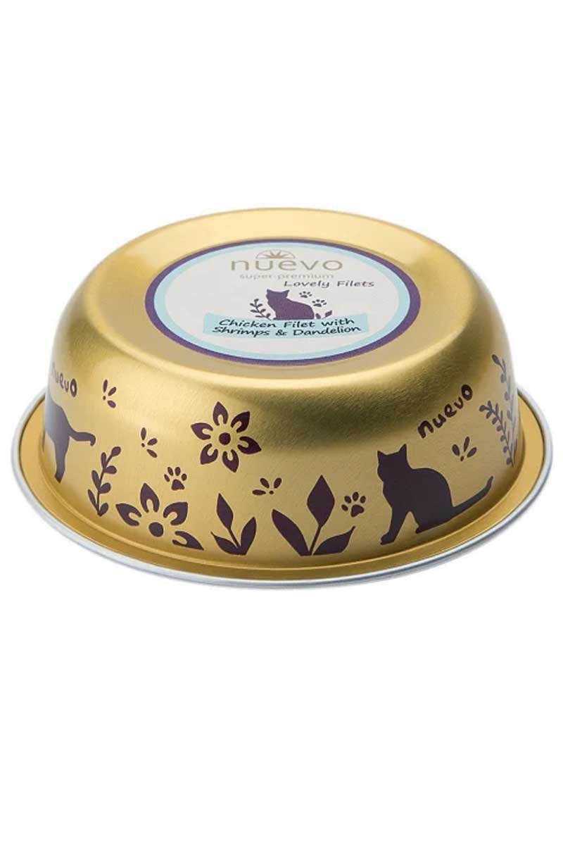 Nuevo Lovely Filets (Куриное филе, креветки) — супер-премиальные консервы для взрослых кошек с куриным филе, креветками, одуванчиком и льняным маслом.