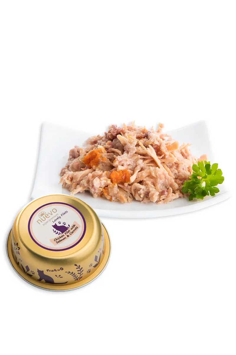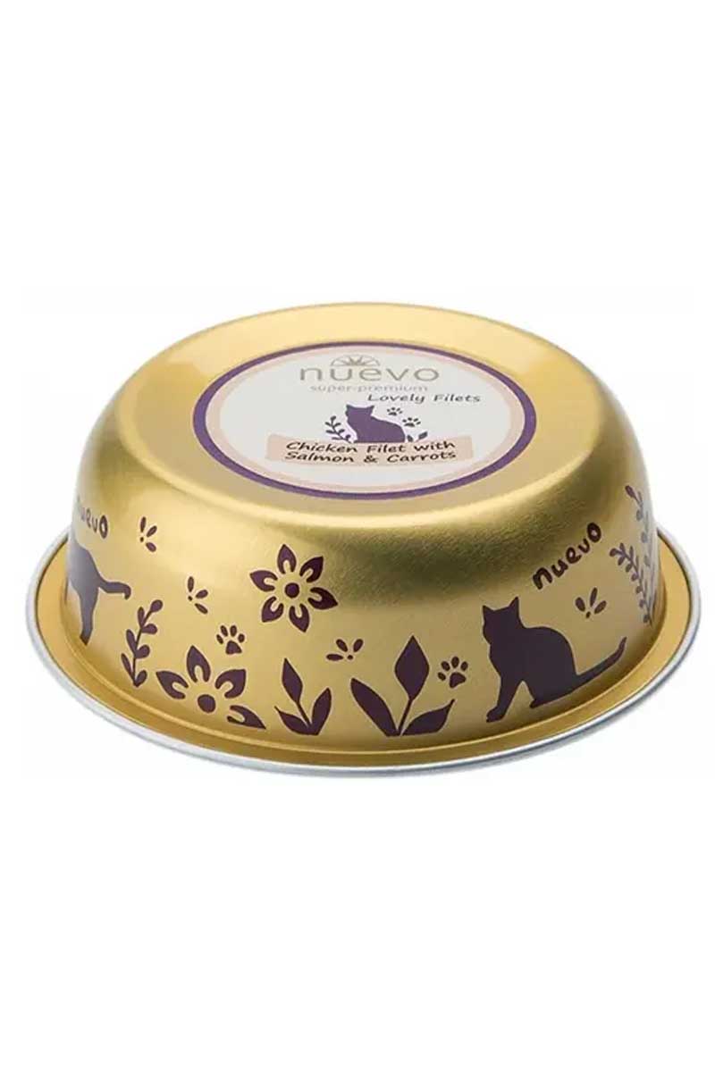Nuevo Chicken Filet with Salmon & Carrots, 85 г - супер-премиальные консервы для взрослых кошек с куриным филе, лососем, морковью и лососевым жиром.