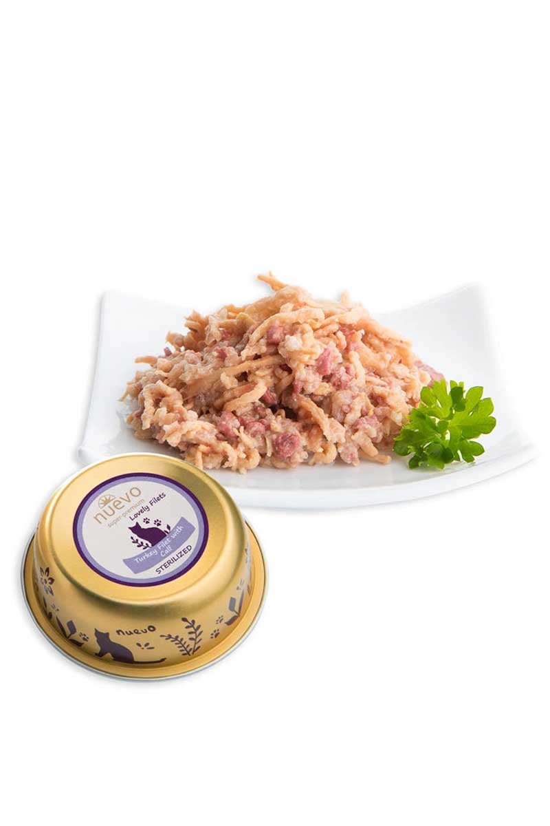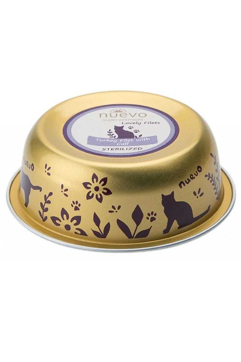 Nuevo Lovely Filets Sterilized (Филе индейки, телятина) — супер-премиальные консервы для взрослых стерилизованных кошек с филе индейки, телятиной и льняным маслом.