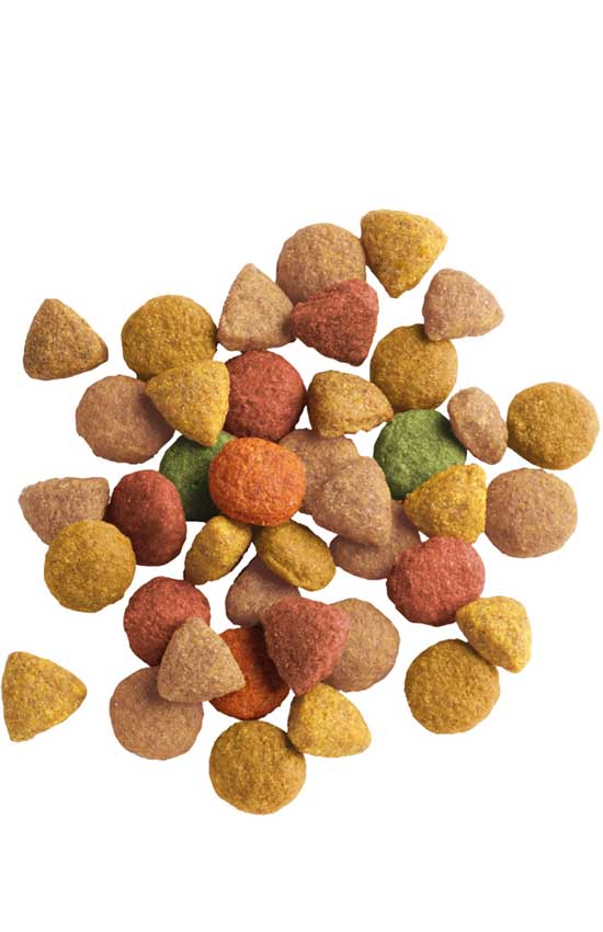 Злаки, мясо и производные животного происхождения (35% из которых 30% курица и 4% индейка), экстракты растительных белков, масла и жиры, производные растительного происхождения (целлюлоза 2%), минералы, овощи, дрожжи, водоросли (спирулина 0,1%).