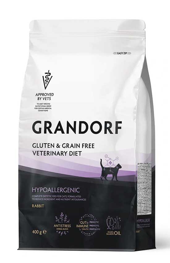 Grandorf Vet Cat Hypoallergenic (Кролик) — полнорационный диетический корм для кошек, применяемый при пищевой аллергии или пищевой непереносимости.