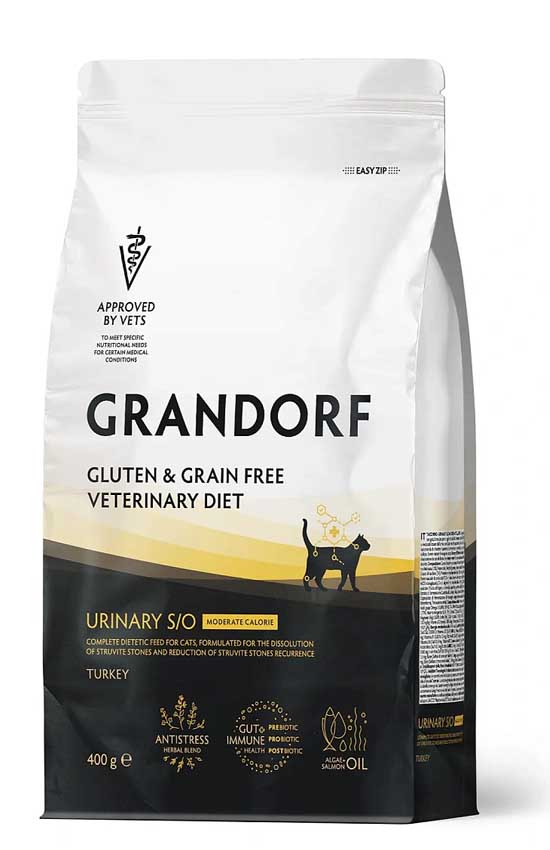 Grandorf Vet Cat Urinary S/O Moderate Calorie (Индейка) — полнорационный диетический корм для кошек, предрасположенных к набору лишнего веса, способствующий растворению струвитных камней и предотвращению их повторного образования.