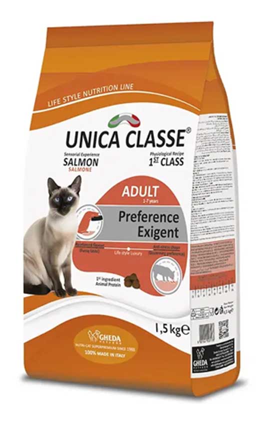 Unica Classe Adult Preference Exigent (Лосось) — это полноценный корм для взрослых кошек старше 1 года, живущих в помещении, требовательных, привередливых, с высокими вкусовыми ожиданиями от корма, с лососем.
