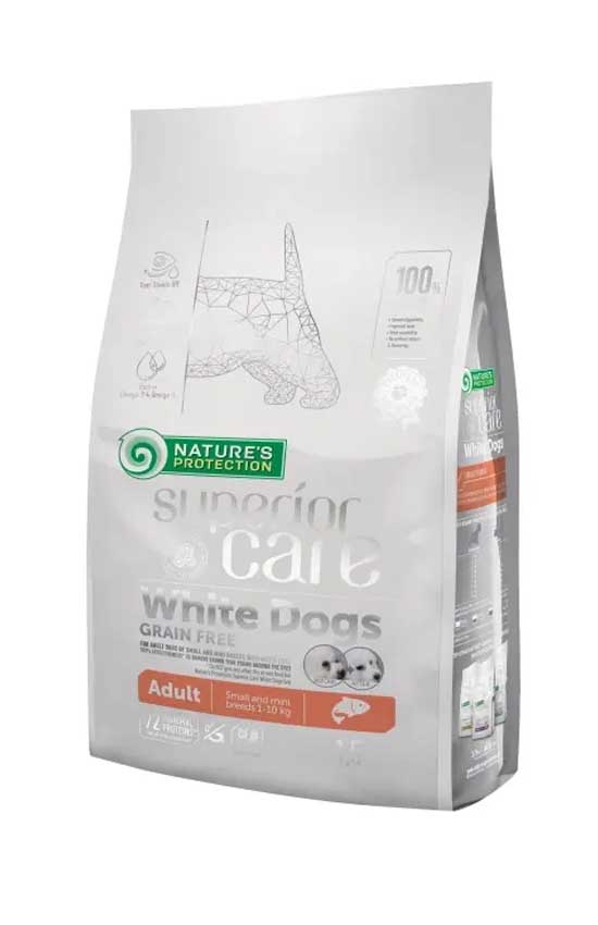 Nature's Protection Superior Care White Dogs Adult Small & Mini Breeds (Лосось) – сухой беззерновой корм для взрослых собак мелких и мини пород с лососем. Это больше, чем просто корм. Это ежедневная оздоровительная система, специально разработанная для маленьких и очень маленьких пород собак со светлой шерстью, склонных к аллергии, от чувствительной кожи и пищеварения до пятен на слезах.