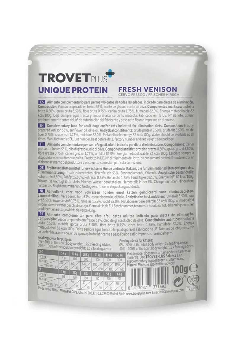 Trovet Plus Пауч Unique Protein (Оленина) — дополнительный корм для собак и/или кошек всех возрастов, подходящий для элиминационных диет. (Элиминационная диета — это метод питания, при котором из рациона исключаются определенные продукты для выявления тех, которые могут вызывать аллергические реакции или чувствительность).