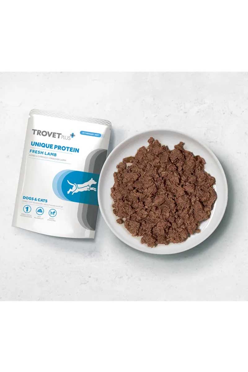 Trovet Plus Пауч Unique Protein (Ягненок) — дополнительный корм для собак и/или кошек всех возрастов, подходящий для элиминационных диет. (Элиминационная диета — это метод питания, при котором из рациона исключаются определенные продукты для выявления тех, которые могут вызывать аллергические реакции или чувствительность).
